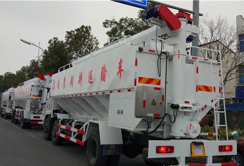 此次用戶訂購的這批散裝飼料運輸車是于農歷新年前訂購的,也是該用戶前期定購2臺液壓飼料運輸車后又再次訂購的電動絞龍散裝飼料運輸車。該車采用東風天錦小三軸系列底改裝,康明斯210馬力發動機,11.00R20鋼線胎,標準分4倉。