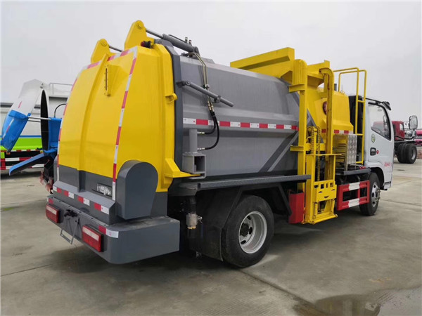 作業控制盒分別安裝在駕駛室內和車尾,駕駛室內的作業控制盒可控制推擠卸料和選擇操作模式(如自動或手動),車尾的作業控制盒則控制壓填機構和翻桶機構的作業,使用操作十分方便。特別是在垃圾填埋場,作業人員無須下車即可完成卸料和污水排放。