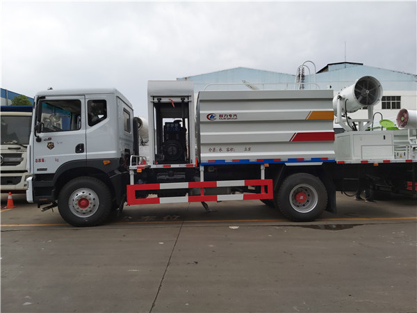 國六D9多功能抑塵車主要由發動機帶動變速箱,變速箱上安裝的取力器帶動灑水泵,灑水泵產生動力,將罐體內部的液體通過管網噴灑出去。工作范圍:自吸高度:≤7m,灑水寬度:≥14m,最大射程:≥28m;可調節成柱狀,射程≥28m;也可調節成霧狀,射程≥5m。