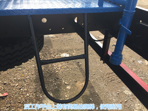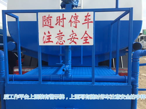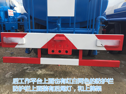 東風(fēng)多利卡D9灑水車罐體下面有灑水車進(jìn)水.出水以及連同的管道,管道排布整齊,一眼就能看清走向,管道到采用一次性成型鋁合金管。防腐能力強(qiáng),不生銹,管道外接口處有防護(hù)欄,紅白兩色非常明顯,后工作平臺上面也有紅白兩色的防護(hù)欄,防護(hù)欄上面裝有后尾燈,和上牌架,后工作平臺上裝有簡易的爬梯,使用耐用,后工作平臺上面裝有警示牌,上面寫有隨時停車注意安全的字樣。