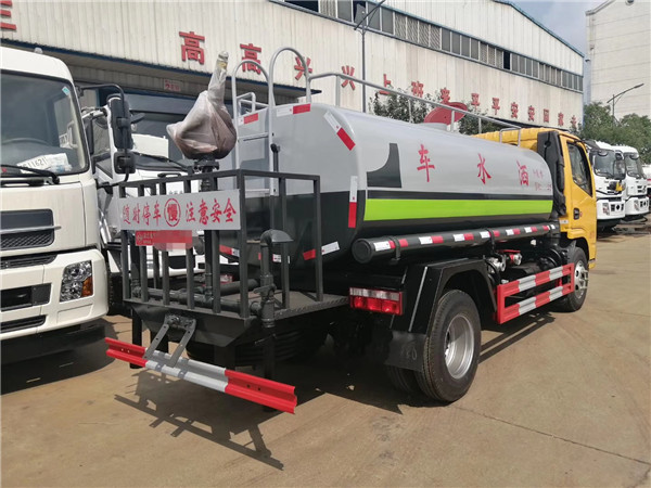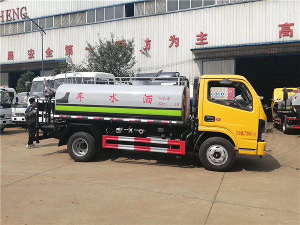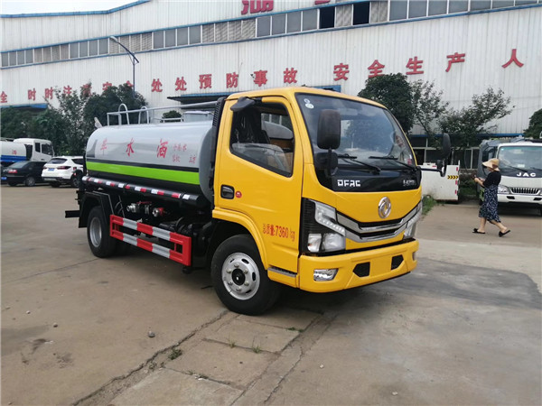 小多利卡5方灑水車(罐體容積:5立方):該車采用東風朝陽柴油發動機,一汽錫柴柴油發動機和昆明云內柴油發動機,白色前翻駕駛室,7.00-16輪胎,汽剎, 5檔變速箱,2噸前橋,4噸后橋,整車外形尺寸:長×寬×高(mm) 5990/1980/2390,總質量(kg)7360,額載質量(kg)3870。罐體有效容積:5噸,帶國家免征公告。