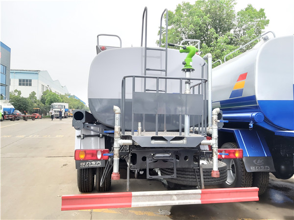 上裝配置:罐體有效容積為5立方灑水車,帶大功率專用灑水泵,罐體鋼板為4MM碳鋼Q235材質(zhì),罐體及整車外形尺寸按照公告。整車前沖、后灑、側(cè)噴、帶65消防接口,后平臺(tái)帶泡不帶門,前封頭帶水位計(jì),后平臺(tái)主管路帶1寸澆花接口,后爬梯。平臺(tái)后部帶小安全告知牌:“隨時(shí)停車,注意安全”,帶兩根水管及陰陽端。罐體顏色:上銀灰下銀藍(lán),罐體兩側(cè)噴“綠化灑水車”字樣,貼反光標(biāo)示。