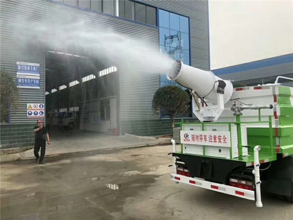 抑塵車噴霧機主要是通過泵對水流進行加壓,之后水流通過炮筒中的幾十個小型噴射口,在風機高速旋轉產生的強大風力中噴灑出去,產生成霧狀,形成了我們看到的噴霧,達到了霧灑的效果。