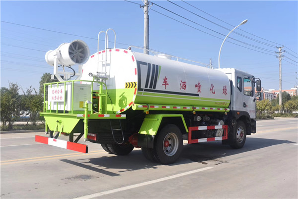 2、側噴、后灑――位于東風D9國六14.5方噴霧車后工作平臺左右兩側,側噴,即向側面噴灑的裝置,后灑,則是向后部噴灑的裝置,兩者水流形態都呈扇形,常用于道路壓塵降溫加濕,噴出的水薄而均勻,可避免噴灑后污水橫流的現象。
