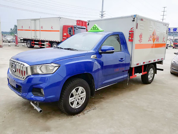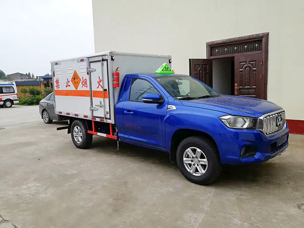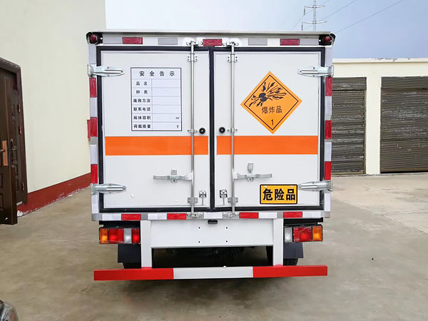 廂體全金屬整體骨架結構,外飾冷軋鋼板(隔熱,防靜電),內飾鋁板(隔熱,防靜電),中間骨架結構(提高廂體強度),所有箱板內部填筑阻燃高強度泡沫板整體高壓粘合鉚接后焊接拼裝成廂型,底板鐵板上鋪設防靜電膠皮(絕緣,導靜電),前臉底部鋁板上加裝靜電防撞膠皮,內飾臥環(固定貨物定位拉環),透氣孔,外部帶通風孔,保持廂體與外部空氣流通,及時與外部空氣交換,確保安全,大梁加裝拖地靜電膠帶,把貨物摩擦靜電導入大地。車輛門框配備防盜報警器,廂內頂部安裝煙霧報警器,前廂板左右立柱安放滅火器,排氣管前置安裝排氣火花熄滅器,駕駛室安裝“危險品”標志燈,車廂外中部粘貼橙色反光帶一周,并在車廂左、右、后安裝“爆炸品”菱形牌3塊,車體后部設置安全告示牌、“危險品”黃色警示牌,后保險杠安裝緩沖加強橡膠塊等。車廂開側門,方便裝卸貨物;可加開隔倉,方便不同性質的爆破物品同車分倉運輸。