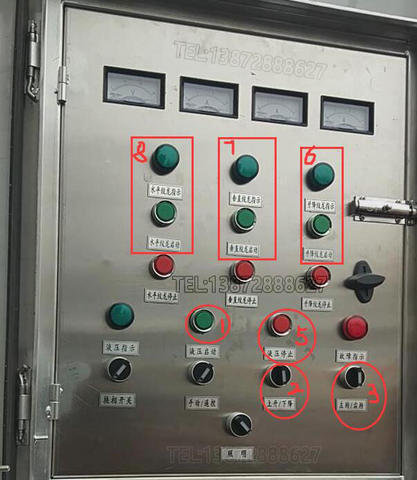 5、依次按下控制箱中的“升絞絞龍啟動(dòng)(圖示6)”、“垂直絞龍啟動(dòng)(圖示7)”、“水平絞龍啟動(dòng)(圖示8)”按鈕,啟動(dòng)卸料動(dòng)作。